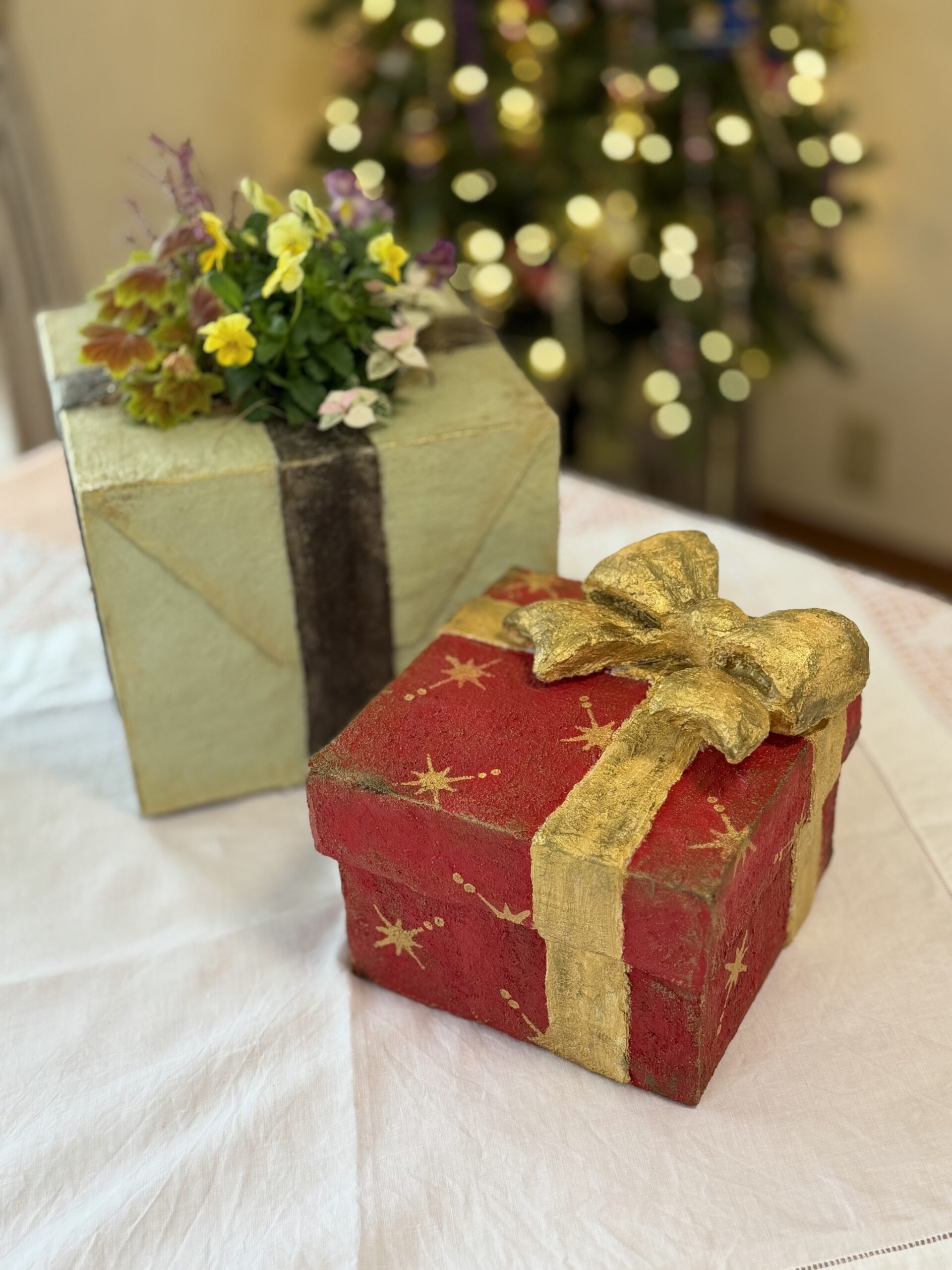 モルタルで出来たGift Box型の鉢です。 リボンもモルタルなので濡れても安心です。